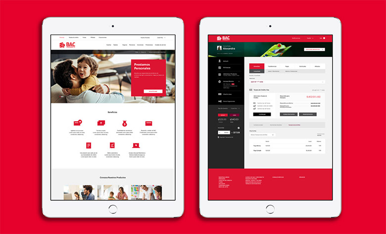 文字部分突出“BAC”(Banco de América Central的縮寫),移除中間的豎杠,將“Credomatic”左右對(duì)齊在“BAC”的底部,盡量讓圖形和文字在視覺(jué)上達(dá)到平衡。同時(shí)也保留了BAC Credomatic原來(lái)的紅色品牌色,并將其發(fā)揮到極致。
